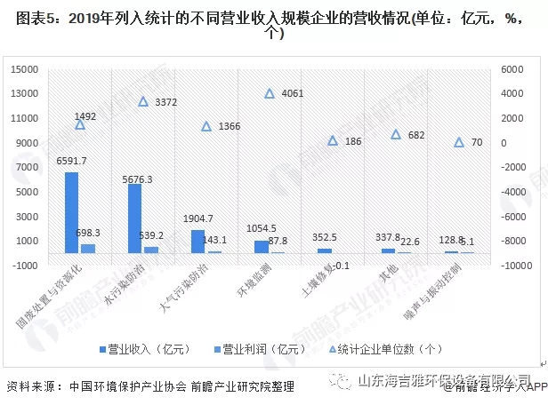据我国环境保护产业协会统计数据,2019年1492家固废处置与资源化企业实现营业收入6591.7亿元,实现营业利润598.3亿元;3372家水污染防治企业实现营业收入5676.3亿元,实现营业利润539.2亿元;1366家大气污染防治企业实现营业收入1904.7亿元,实现营业利润143.1亿元。