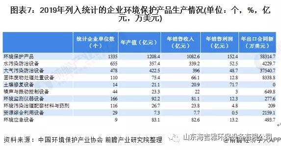 在《2020环保产业发展状况报告》中,2019年纳入统计的环保设备市场共有1583家企业;年产值为1018.60亿元,销售收入和销售利润分别为949.10亿元和135.80亿元,实现出口合同额51245.60万美元。