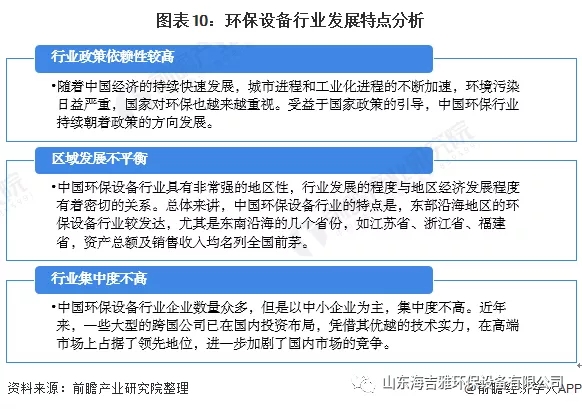 环保设备行业的发展共有三大特点,分别是政策依赖性较高、区域发展不平衡及市场分散,竞争激烈。具体分析如下: