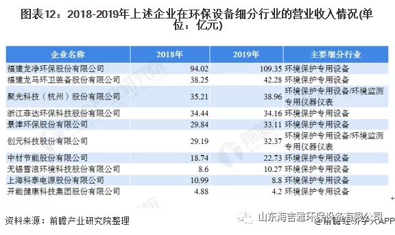 我国的环保设备企业市场规模普遍不大,大多数企业为中小型企业。从企业性质来看,在中国环保设备制造行业中占据主导地位的是私营企业。在其环保设备细分行业中,2019年福建龙净环保的营收为109.35亿元,其营收占了前十企业环保设备行业营收的32.52%,其占据着环保设备行业不可撼动的位置;其后依次是龙马环卫、聚光科技、菲达环保,分别占前十企业环保设备营收的12.57%,11.59%和10.16%。