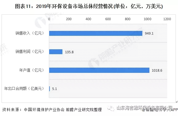在《2020环保产业发展状况报告》中,2019年纳入统计的环保设备市场共有1583家企业;年产值为1018.60亿元,销售收入和销售利润分别为949.10亿元和135.80亿元,实现出口合同额51245.60万美元。