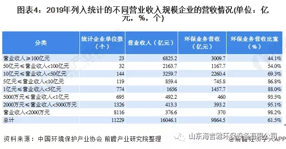 我国环境保护产业协会统计企业共有11229家,其中共有大型企业385家、中型企业2728家、小型企业3957家、微型企业4159家。其中,大、中型企业数量占比分别为3.4%、24.3%;小、微型企业数量占比为72.2%,可见,我国环保企业仍以小微型企业为主。大型企业数量少,产出贡献大,80%以上的产业营业收入集中于占比约10%的营业收入过亿的企业。92.0%的营业收入、87.6%的环保业务营业收入集中在年营业收入1亿元以上的企业,该部分企业的单位数量占比仅为9.8%,营业收入在2000万元以下的企业单位数量占比高达72.3%,其营业收入占比仅为2.3%、环保业务营业收入占比3.8%。营业收入规模越小的企业,环保业务营业收入在总营业收入中所占比重越高,其环保专业化程度也越高,营业收入超过l00亿元的企业,环保业务营业收入平均占比为44.l%,营业收入小于2000万元的企业,其环保业务营业收入平均占比达98.2%。