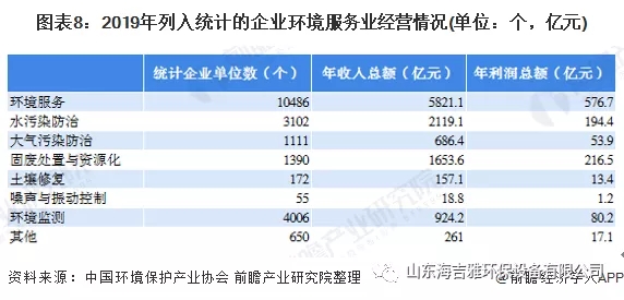 据环境保护产业协会数据,2019年我国列入统计的环境服务企业共10486个,年收入总额为5281.1亿元,年利润总额为576.7亿元。